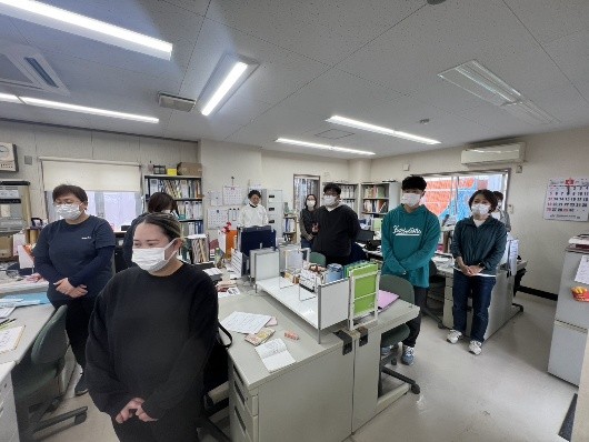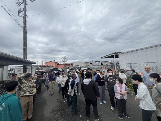 その後、理事長から年度始めにあたっての挨拶をいただいているときに、大きな揺れとともに緊急地震速報が流れたため、職員がすぐに利用者の活動場所を確認した後に避難誘導を行いました。その誘導に従い、利用者はいつも避難訓練のときに集合する場所に向かって移動し、避難訓練のときよりも早く点呼まで行うことができました。利用者、職員ともに日頃の訓練の成果を発揮することができていました。